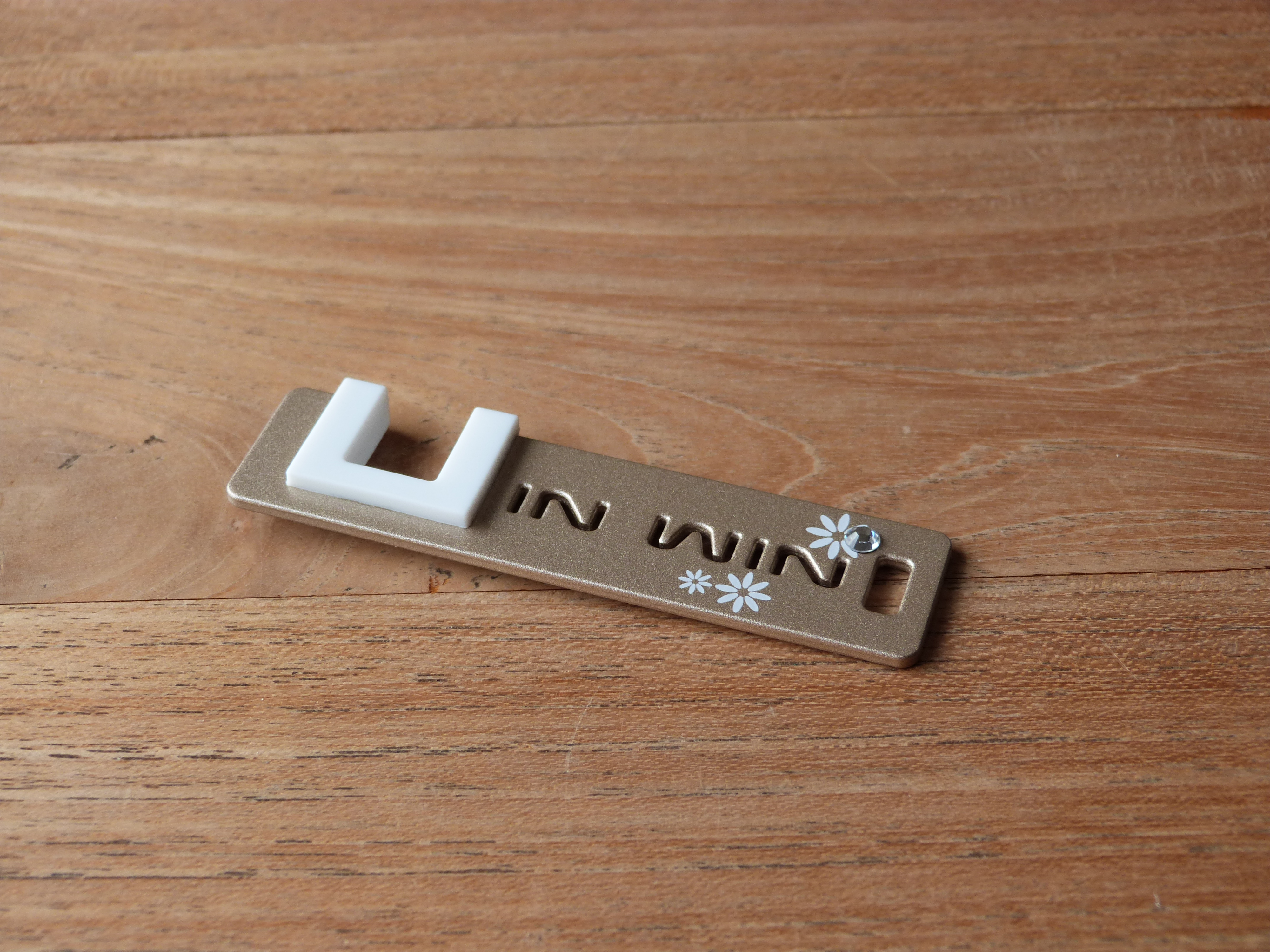 De iBite is een klein plaatje aluminium met hierin een paar uitsparingen, deze uitsparingen zijn; het logo van In Win, een opening waarmee hij aan je sleutelbos kan en een opening om je telefoon in te steken. Om deze laatste zit ook een stukje rubber. Met de iBite is het mogelijk je telefoon in zowel ‘portrait’ als landscape recht op te zetten, maar als je telefoon wat te groot is zal de portrait stand niet goed werken in verband met het feit dat het dan topzwaar wordt. Dit had ik met zowel een One Plus One als een LG G3, onder de vijf inch lukt het meestal wel. Ook mag de telefoon niet te dik zijn, ik heb meerdere low-end Lumia telefoons geprobeerd en deze pasten er bijna allemaal niet in. Voordat je de iBite koopt zou ik dus even goed kijken of je telefoon er wel in past.